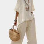 Celkový minimalistický Daisy v prírodných odtieňoch s oversized blúzou a širokými nohavicami pre jednoduchý a elegantný štýl