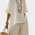 Čistá jednoduchosť s prirodzenou eleganciou. Sada Daisy vyniká uvoľnenou a monochromatickou siluetou, ideálnou pre tých, ktorí hľadajú pohodlie a čistý štýl. Vyrobené z ľahkého materiálu, tento vzhľad sprevádza každý pohyb s sviežosťou a elegantnou uvoľnenosťou.