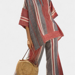 Oversize Daisy Salopeta z Lnu s Pruhy v Červenej Korálovej a Šedej, Moderný a Pohodlný Štýl