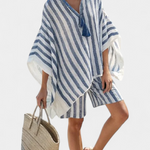 Námornícka sviežosť s uvoľneným šarmom. Sada Nancy sa vyznačuje oversized košeľou s pruhmi v námorníckej modrej a bielej farbe, kombinovanou s elegantnými šortkami pre letný a bezstarostný vzhľad. Detaily ako výstrih s dekoratívnymi třásňami a textilné zakončenie dodávajú charakter a ľahkosť.