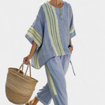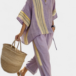 Uvoľnená elegancia s umeleckým nádychom. Sada Daisy v jemnej levanduli s horčicovými detailmi kombinuje prírodnú sviežosť s boho dizajnom, ideálna na prechádzky pri mori alebo letné popoludňajšie vychádzky s pohodlným štýlom.