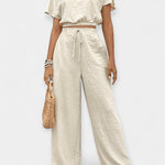 Tento set vyniká voľným strihom a absolútnym pohodlím, ktoré ponúka. Krátky top s nafúknutými rukávmi sa harmonicky kombinuje s vysokými nohavicami s šnúrkou, čím vytvára štýlový vzhľad s boho akcentmi – ideálny na najteplejšie dni v roku.
