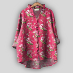 Romantická ľanová blúzka v intenzívnej ružovej farbe s kvetinovým vzorom ruží, ktorá vyžaruje ženskosť a eleganciu. V-krčný výstrih s jemnými volánmi a voľný strih poskytujú pohodlie a vzdušný pocit, zatiaľ čo asymetrický lem s dlhšou zadnou časťou dodáva moderný charakter každému outfitu.