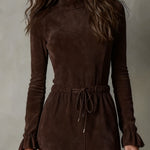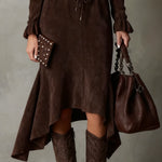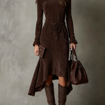 Cecily Elegantné tmavo hnedé semišové midi šaty s šnúrkou sú dokonalou kombináciou sofistikovanosti a súčasného štýlu. Vyrobené z mäkkého umelého semišu, tieto midi šaty majú lichotivý pás na šnúrku, ktorý vám umožní prispôsobiť si strih a zároveň udržať elegantnú siluetu. Asymetrický lem dodáva moderný nádych, zatiaľ čo dlhé rukávy a uvoľnený dizajn zabezpečujú pohodlie. Ideálne pre neformálne výlety alebo večerné akcie, tieto šaty ponúkajú chic, ale zároveň uvoľnený vzhľad.