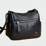 Moderná dámska taška cez rameno v elegantnej čiernej farbe, vyrobená z vysoko kvalitnej ekologickej kože s hladkou textúrou. Disponuje praktickým dlhým popruhom pre pohodlné nosenie na ramene alebo cez telo, zatiaľ čo viac vonkajších vreciek so zipsom a gombíkmi ponúka extra priestor a organizáciu. Diskrétne logo na prednej strane pridáva luxusný detail. Ideálna voľba pre každodenné používanie, pretože kombinuje štýl a funkčnosť.