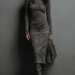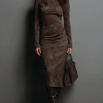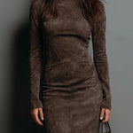 Chic Elegance Midi šaty z semišu s vysokým krkom a dlhým rukávom