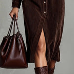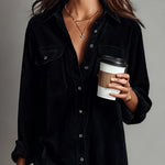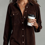 Tieto košilové šaty majú uvoľnenú siluetu s gombíkovou prednou časťou a špicatým golierom pre neformálnu sofistikovanosť. Dlhé rukávy sú voľne ohrnuté a dve vrecká na prsiach pridávajú funkčný detail. Mäkká štruktúra kordu prináša útulný, obnošený pocit, zatiaľ čo dĺžka po kolená a jemne zakrivený lem robia z týchto šiat ideálnu voľbu pre štýlové uvoľnené dni.