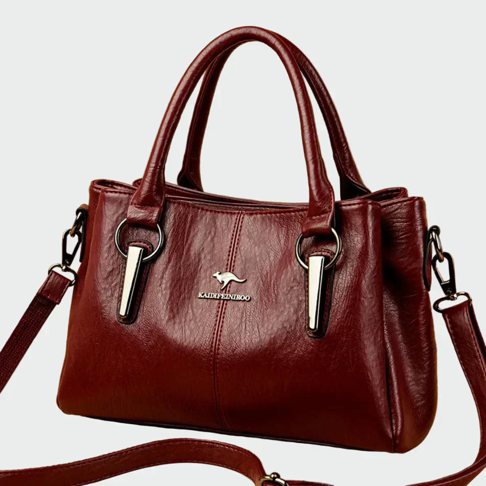 Elegantná dámska kabelka v bordovej farbe s nadčasovým dizajnom, ktorý vyžaruje jemnosť. Disponuje odolnými uchami pre pohodlné držanie a tiež odnímateľným ramenným popruhom pre väčšie pohodlie. Kovové detaily v striebornom tóne dodávajú moderný nádych, zatiaľ čo jej praktická veľkosť ju robí ideálnou pre každodenné použitie, ale aj pre elegantnejšie príležitosti.