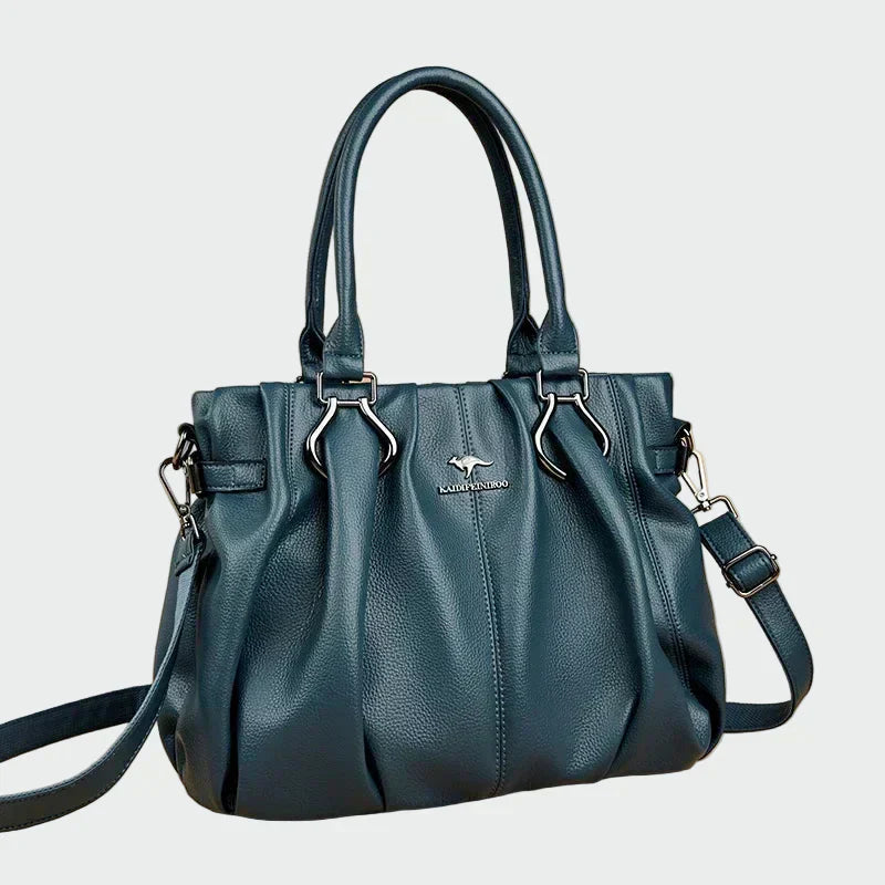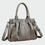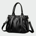 Elegantná dámska kabelka v čiernej farbe, s reliéfnou textúrou kože a moderným dizajnom s plisovaním na prednej strane. Disponuje dvojitými uchami pre pohodlné držanie a odnímateľným nastaviteľným popruhom pre nosenie na pleci. Ideálna voľba pre každodenné použitie, ale aj pre elegantnejšie príležitosti, ponúka praktickosť a štýl.
