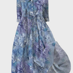 Dlhé šaty v odtieňoch levandule a modrej kvetinový vzor prináša sviežosť, zatiaľ čo ľahké prevedenie je ideálne pre jarné a letné príležitosti.