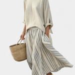 Prírodná a elegantná, súprava Daisy oslavuje stredomorskú sviežosť s mäkkým tričkom s voľnými rukávmi a vzdušnou midi sukňou s pruhmi. Vyrobená z ľanového bambusu s jemnou textúrou a plynulým strihom, je to ideálna voľba pre slnečné dni, pobrežné prechádzky alebo pokojné úniky s pohodlným štýlom.