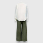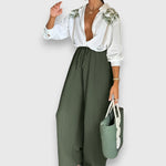 Sada Nivana kombinuje elegantnú blúzku s jemným kvetinovým vzorom a splývavé nohavice so širokými nohavicami – ideálne na štýlové dni. Ľahký materiál a vysoký golier dodávajú celku ženský a náročný nádych.